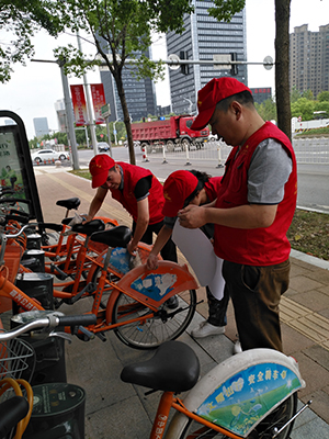 此次活動旨在為進一步深化黨員志愿服務,弘揚雷鋒精神,充分發揮黨員先鋒模范作用,鞏固文明創建成果,公司黨員以小組為單位紛紛來到各公共自行車網點,為自行車“洗洗臉”,黨員們先將自行車上的“牛皮癬”仔細清除干凈,然后將全新的“綠色出行、低碳環保”的宣傳畫黏貼上去,使公共自行車煥然一新。