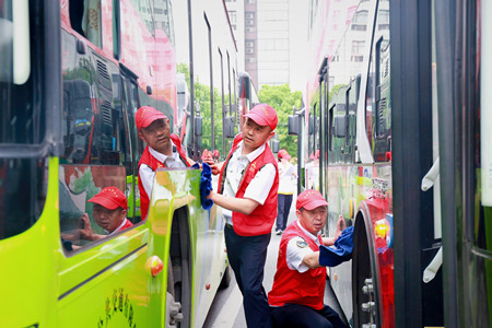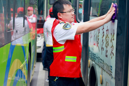 5月20日上午,由公司黨政領導班子成員、部分中層干部、黨員、青年團員等組成的公交志愿者隊,分別前往嘉興火車站和高鐵嘉興南站開展關愛駕駛員志愿服務活動。廣場上,志愿者們分工有序,協(xié)作配合,有的拿著水桶和抹布,為到站車輛擦拭司機室、車窗玻璃、車身、扶手桿、線路頭牌等,有的用拖把清洗易臟的輪轂、車廂地板,有的專門負責清理廣場上隨意丟棄的煙頭等垃圾,還有的用長柄的刷子支起抹布擦洗車輛較難清洗的部位,大家干得熱火朝天,不亦樂乎,為的就是讓駕駛員師傅們能夠多一點時間休息。有些駕駛員看著志愿者們忙里忙外地打掃車輛衛(wèi)生,有些不好意思道:“還是我們自己來吧。”志愿者們笑著答道:“司機師傅,你們辛苦了,多休息會兒吧,讓我們也好好服務你們一回。”