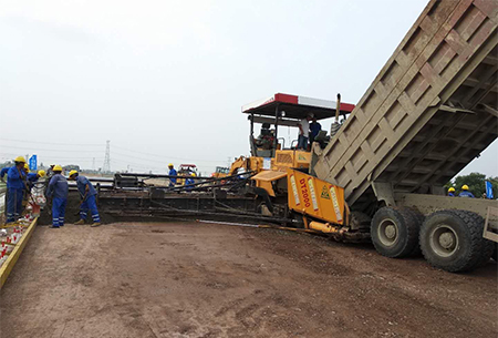 6月19日,TJ06標項目部對該路基段進行水穩底基層攤鋪工作,隨著滿載水穩混合料的自卸車緩緩倒入攤鋪機前端受料斗,兩側長螺旋快速轉動、均勻地送料至整個橫斷面上,灣北二期路面拉開水穩試驗段底基層攤鋪工作序幕。該試驗的數據將作為下一步灣北二期全面開展路面水穩施工的依據。