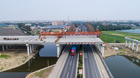3月23日,位于灣北二期工程TJ02標段的跨320國道橋最后一片梁板穩穩降落在國道兩側蓋梁砂筒上,跨320國道橋十片箱梁架設宣告完工。