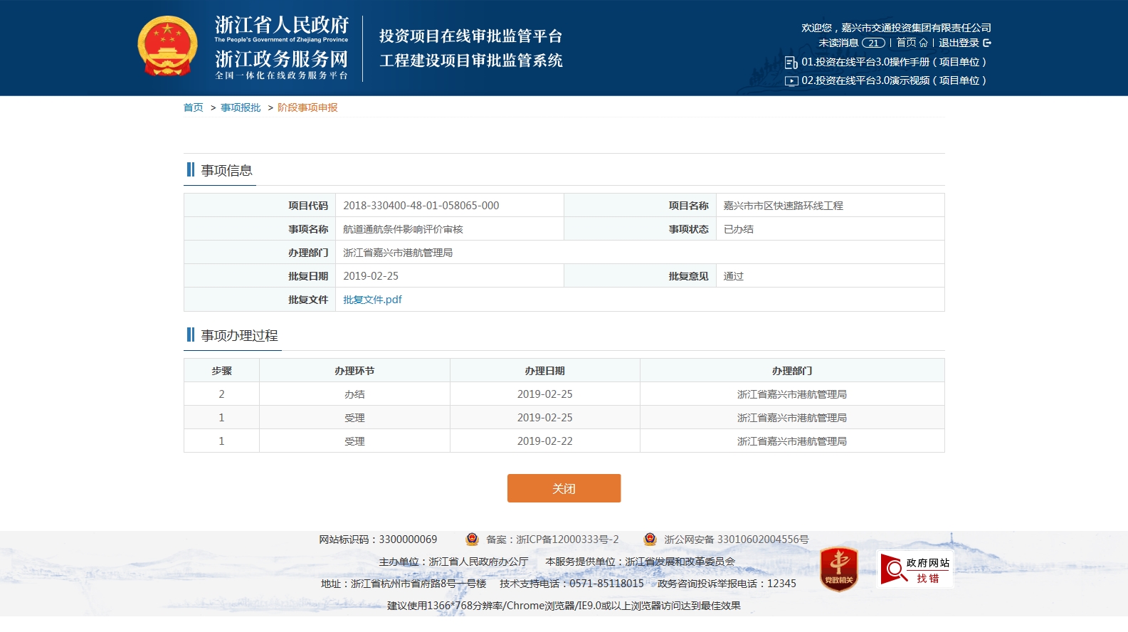 嘉興市市區快速路環線工程一期航道通航條件影響評價審核